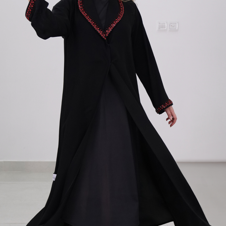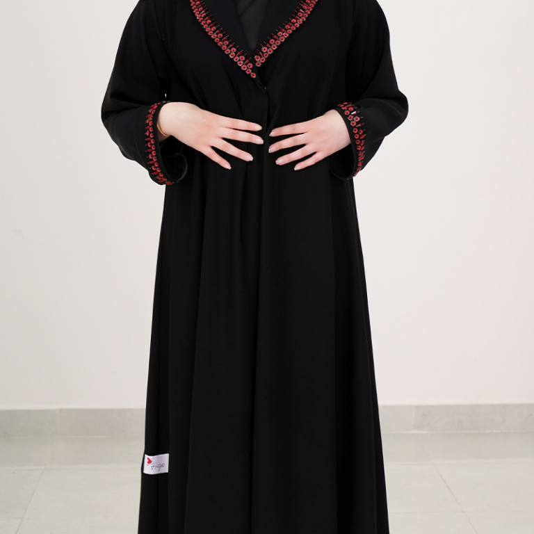 عباءة أنيقة باللون الأسود مع تطريزات حمراء مميزة