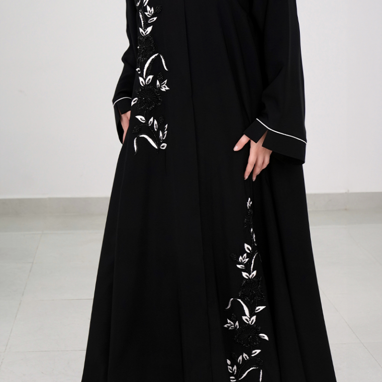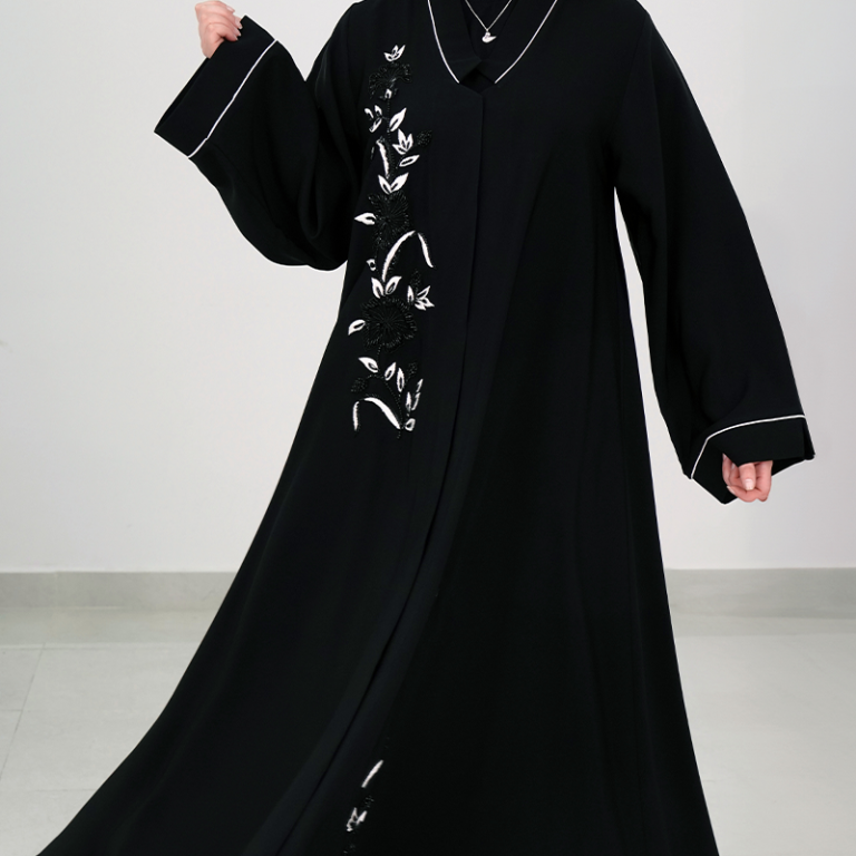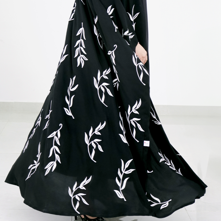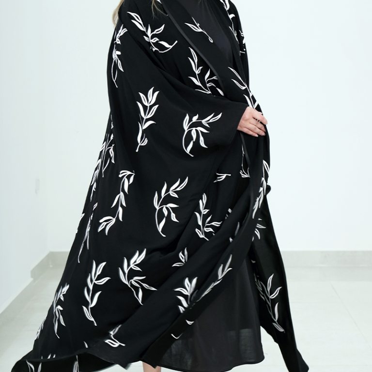 عباية سوداء مطرزة بأوراق بيضاء راقية