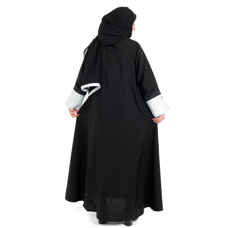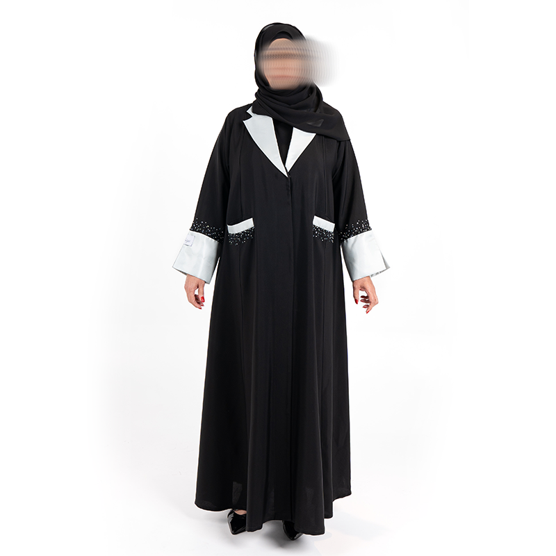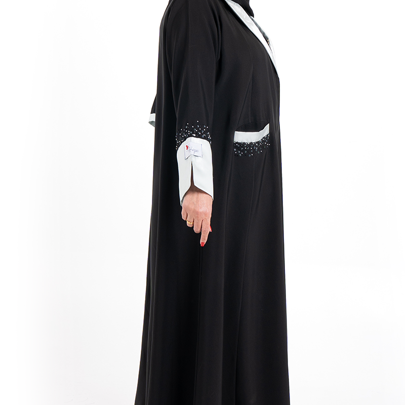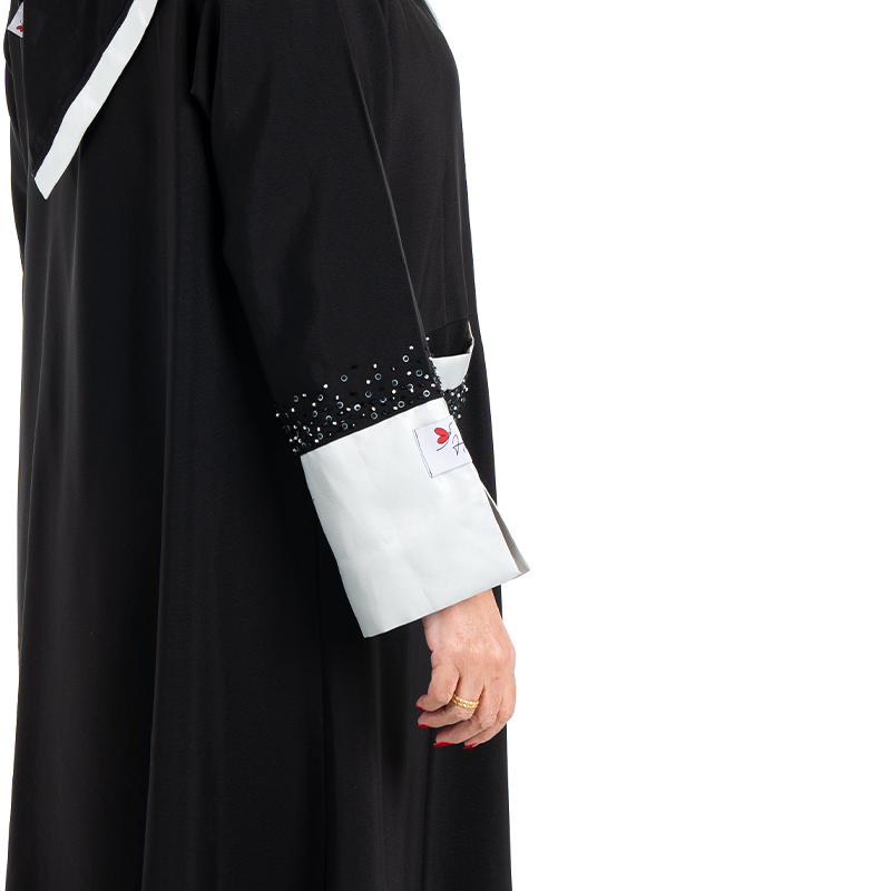 عباءة سوداء مصممة بأسلوب كلاسيكي يناسب الإطلالات الرسمية وغير الرسمية. تتميز بتفاصيل بيضاء بارزة على الأكمام والياقة والجيوب، مما يضفي لمسة من التباين الجذاب. الزخارف الدقيقة والتطريزات السوداء الصغيرة تعزز من جمال التصميم. مصنوعة من قماش عالي الجودة لضمان الراحة والأناقة في كل مناسبة.
