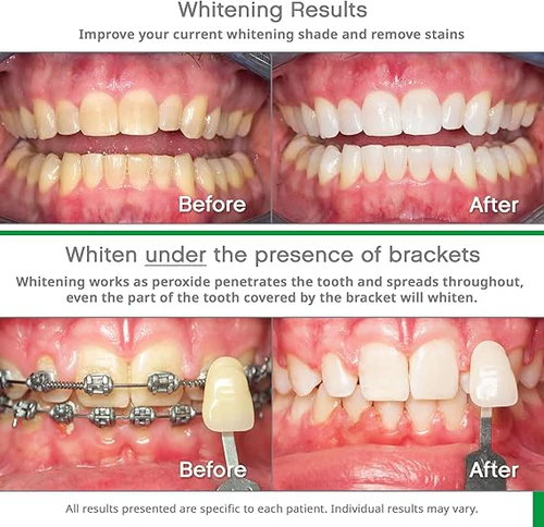 تبييض فعّال: حسب الشركة، ممكن تفتيح الأسنان حتى ~5 درجات خلال حوالي 10 أيام من الاستخدام المنتظم.