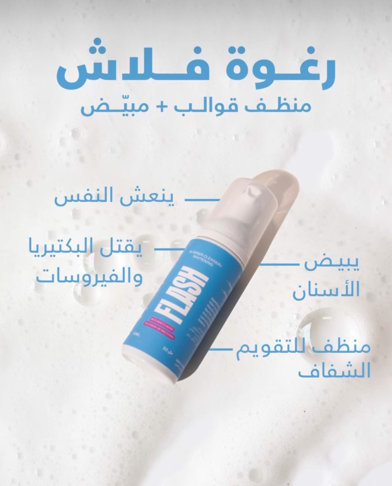 تركيبة التنظيف الأصلية من رغوة فلاش البيضاء تمنحك عناية كاملة بتقويم الأسنان وصحة الفم في تطبيق واحد سهل.